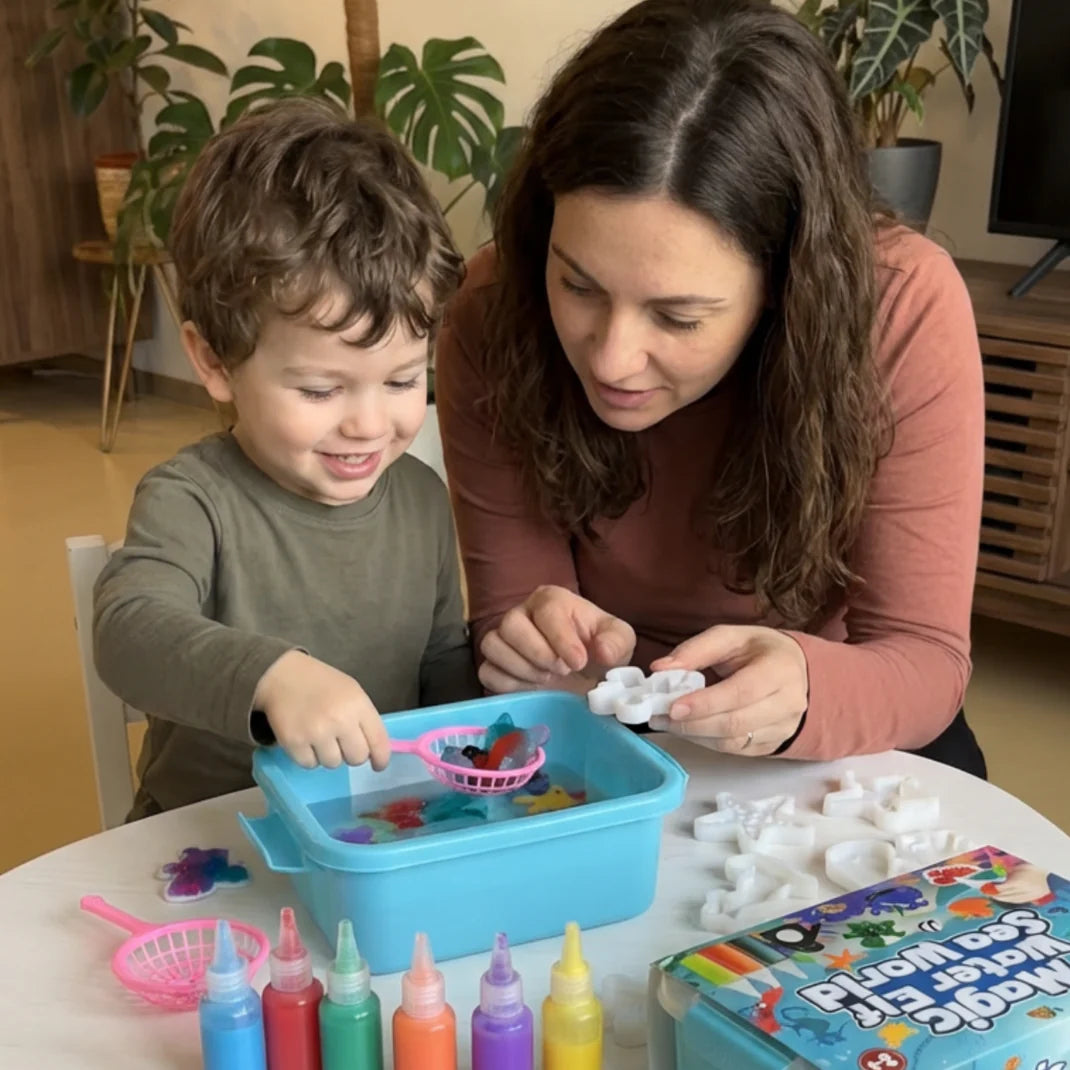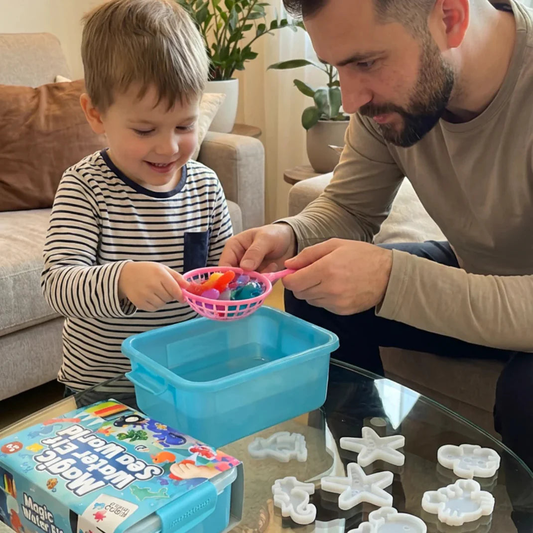 ✔ Kreatywny zestaw z wodnymi skrzatami, brokatowymi żelami i modelami zwierząt morskich – dzieci obserwują magiczne zmiany kolorów i tekstur