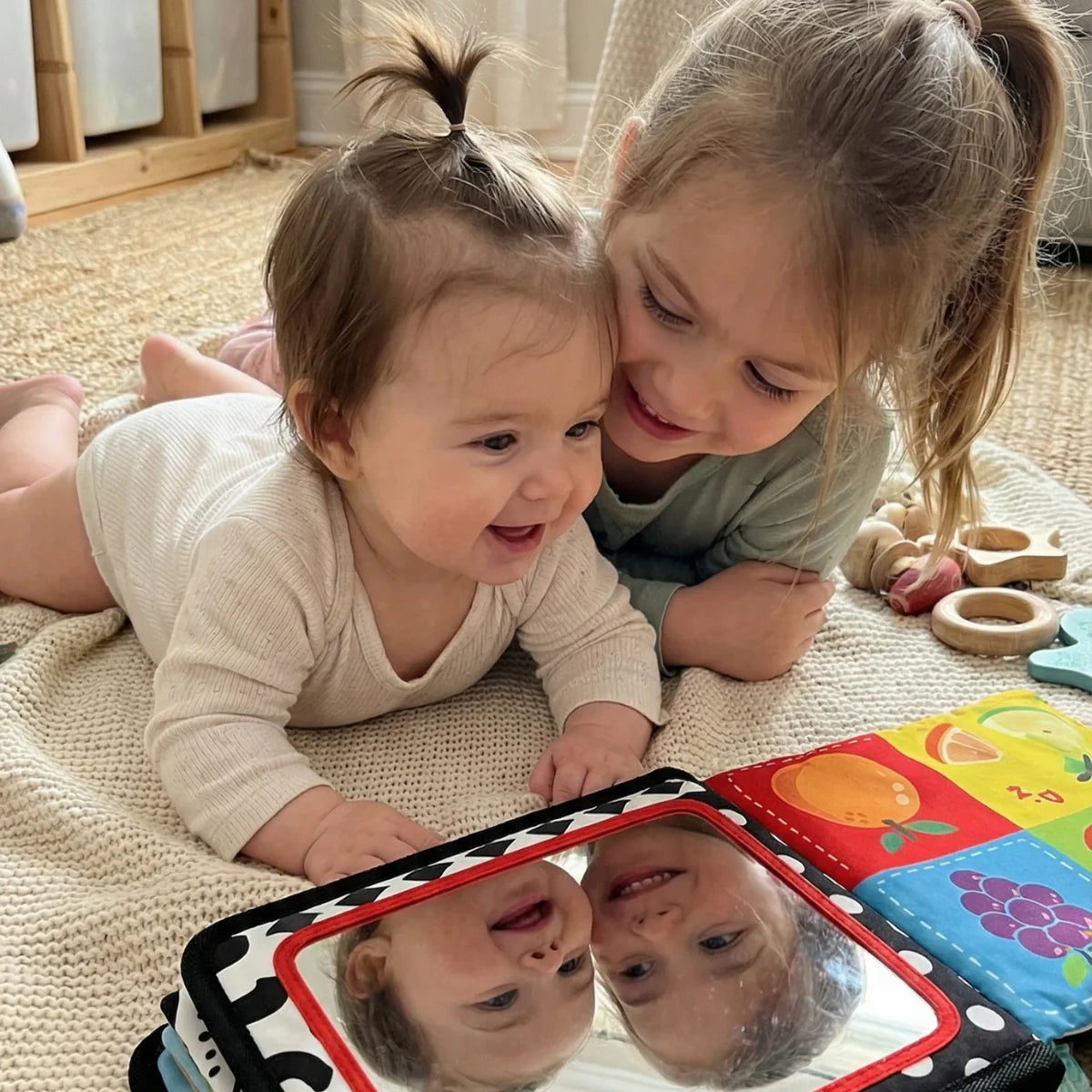 ✔ Wspomaga rozwój wzroku na różnych etapach – od kontrastowych wzorów czarno-białych i czerwonych po kolorowe zwierzątka i lusterko