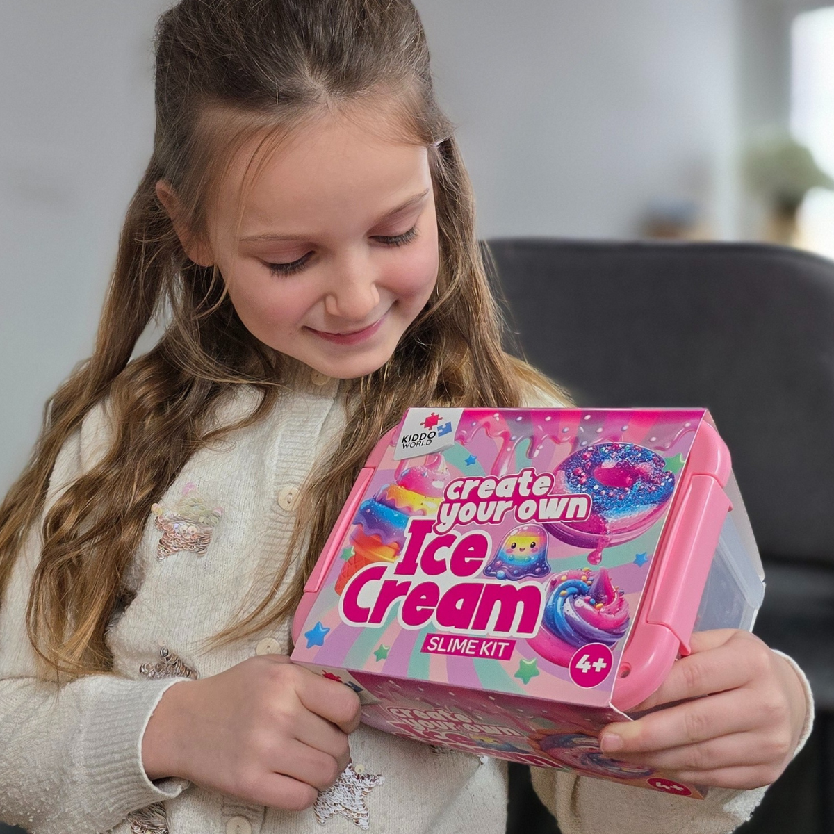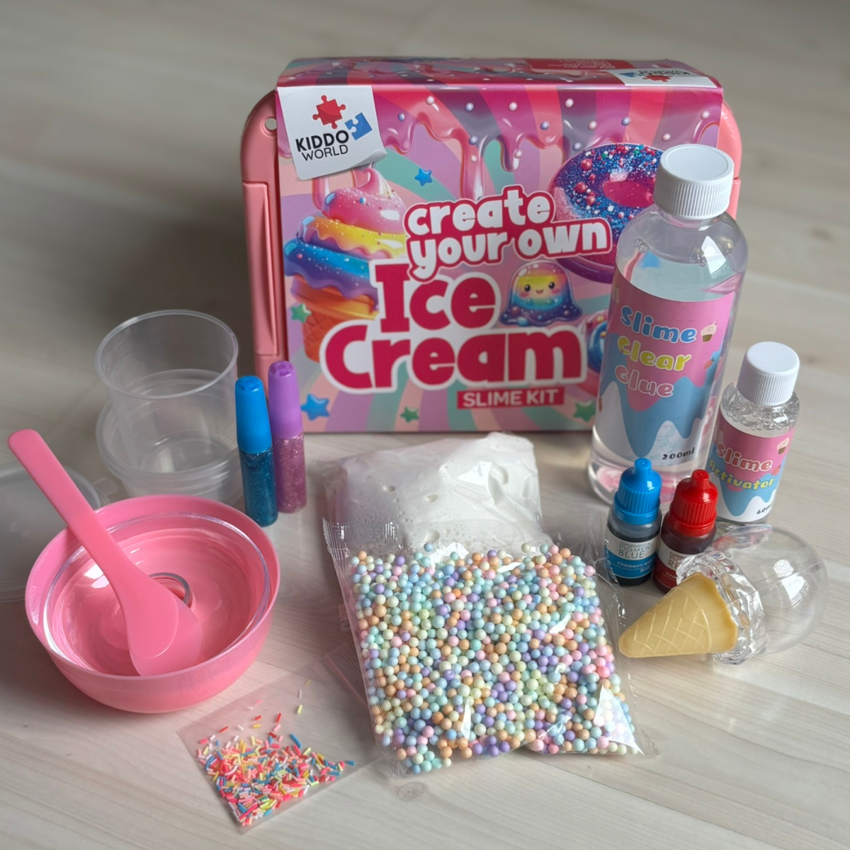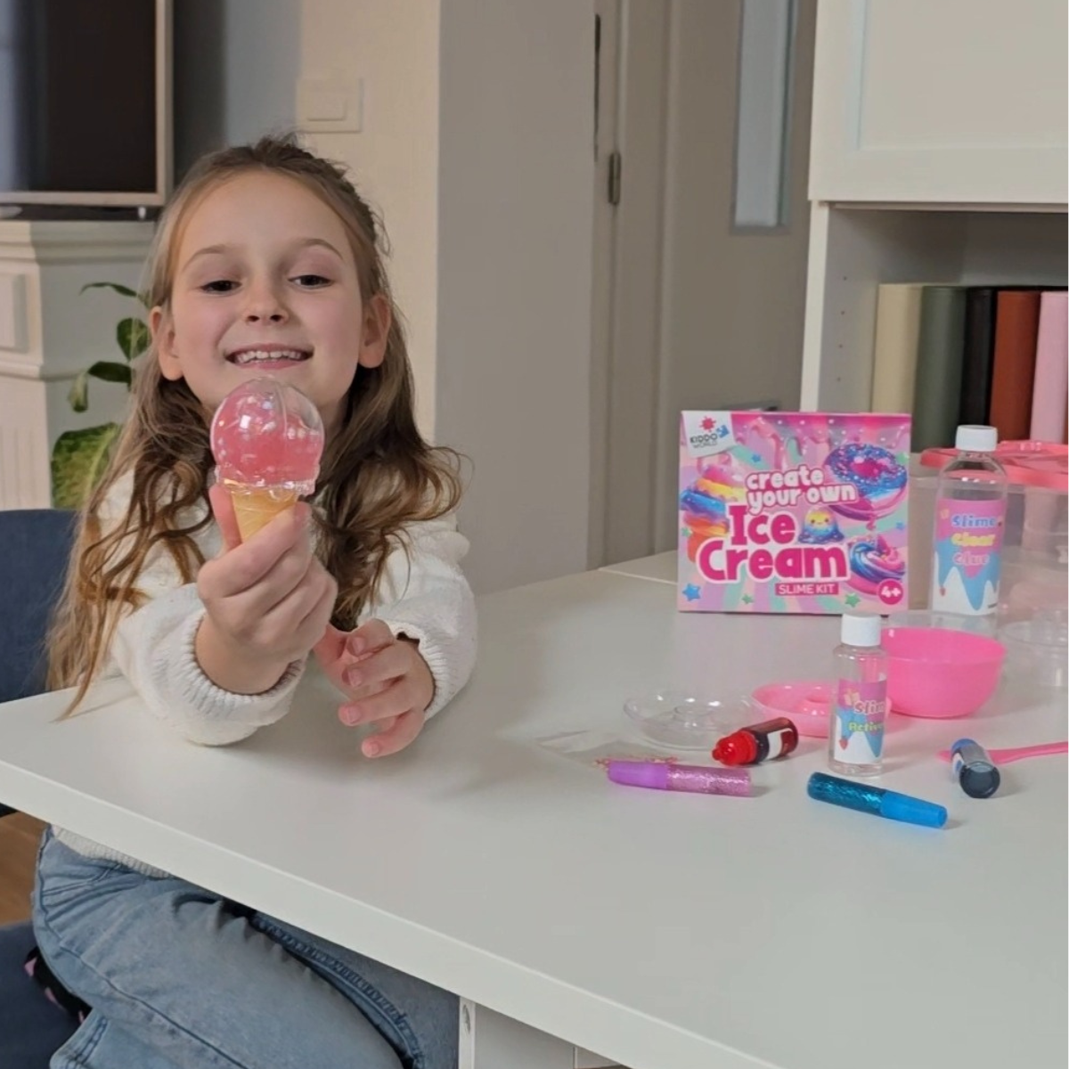 Kreatywny zestaw SLIME, w którym dzieci same mieszają i tworzą własny lodowy slime – bez bałaganu i bez stresu. Mieszając składniki powstaje miękka, gładka i nieklejąca się masa, pełna kolorów i zabawnych dodatków, którą dzieci mogą rozciągać, ściskać i formować w lodowe kreacje, bez przyklejania się do rąk czy powierzchni.