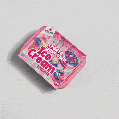 1× 200 g klej do slime, 1× 40 g aktywator slime, 2× pigment, 1× woreczek miękkiej glinki, 3× pojemniki, 1× buteleczka w kształcie rożka lodowego, 1× miarka, 1× miska do mieszania, 1× piankowa kulka w mieszanych kolorach, 1× woreczek mini posypek lodowych, 2× brokat, 2× proszek mica, 1× pudełko do przechowywania, 1× instrukcja