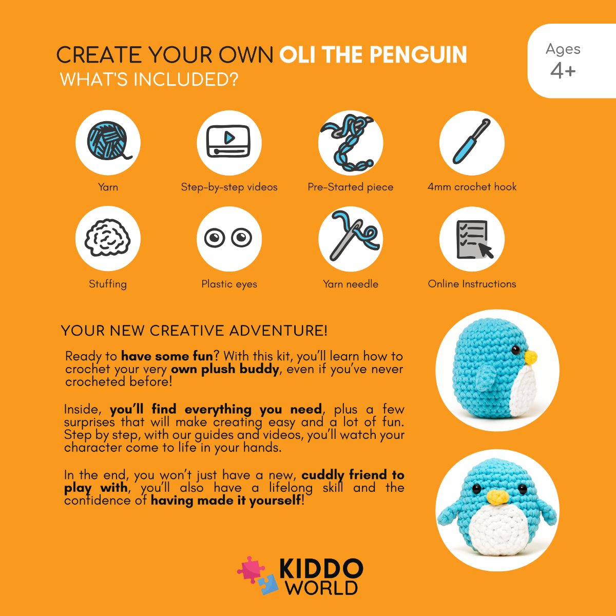 Piękny zestaw do szydełkowania dla początkujących | Pingwin Oli dla małych i dużych twórców, dla dzieci 8+
